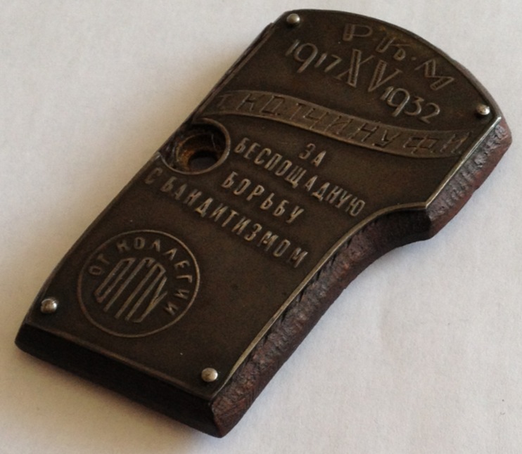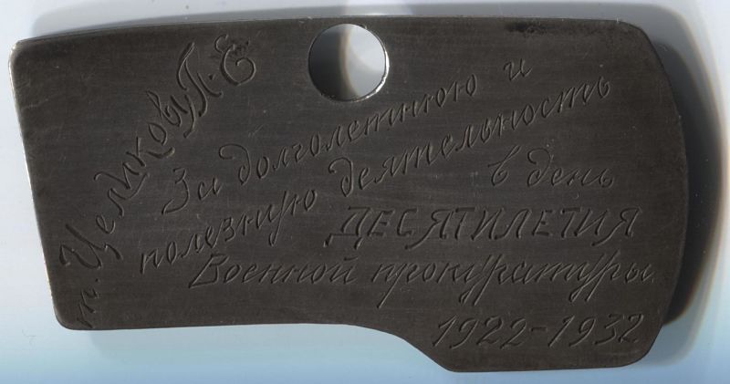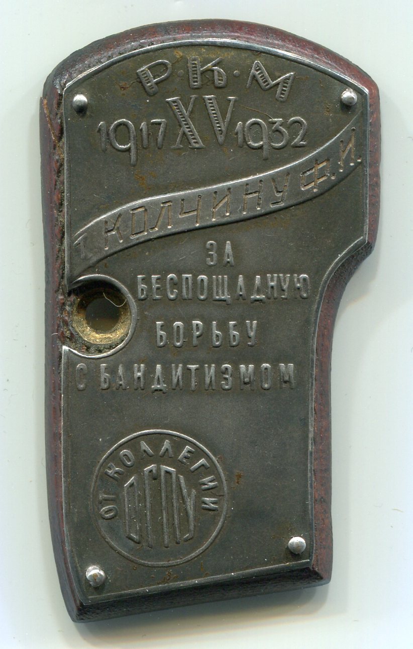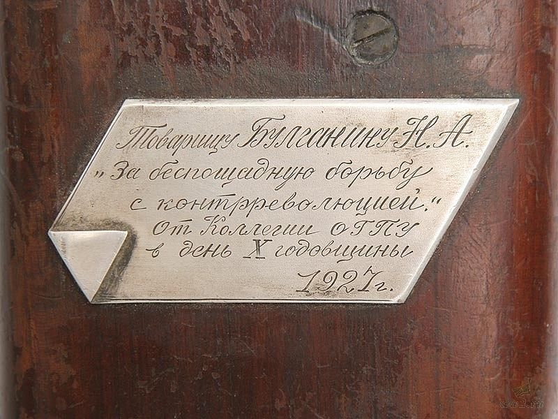 Надпись на серебряной щечке "? ? ? в день XV-й годовщины органов ВЧК-ОГПУ 20/XII 32 г. от железно-дорожников 4-го района"