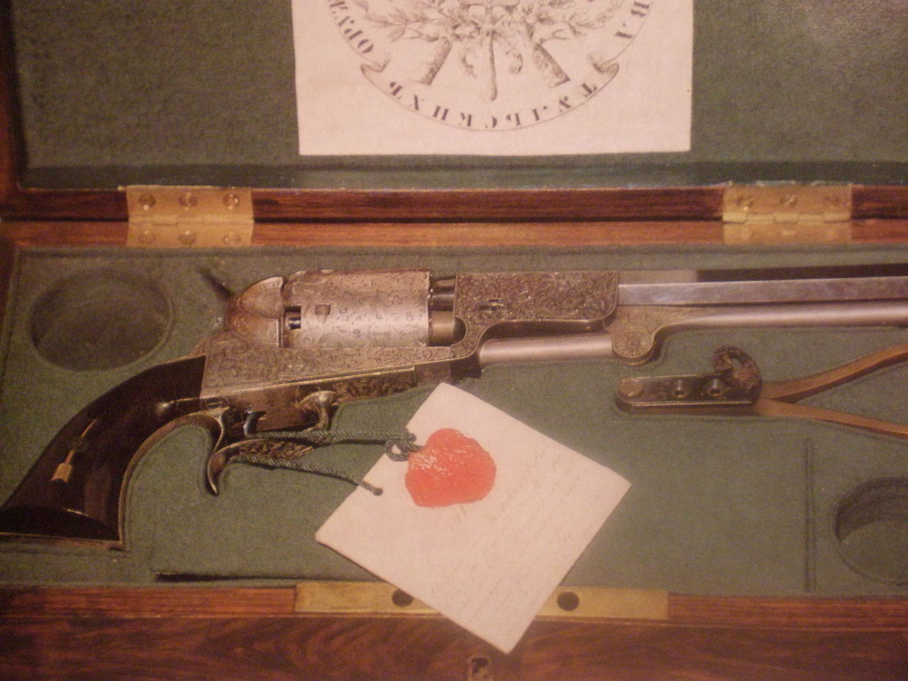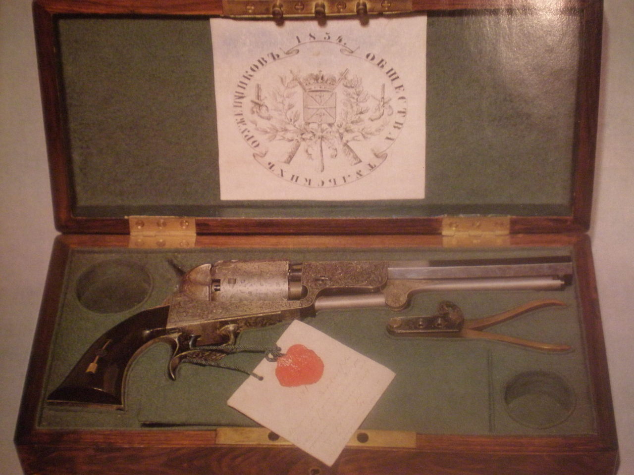 Если точнее, при своем первом визите в Россию в 1854 Кольт подарил Николаю I три револьвера – драгунскую модель 1849 3-го выпуска, морскую модель 1851 Нейви и карманную модель 1849 Покет:Инженер-механик писал(а) :в 1854г. С.Кольт посетил С.-Петербург,