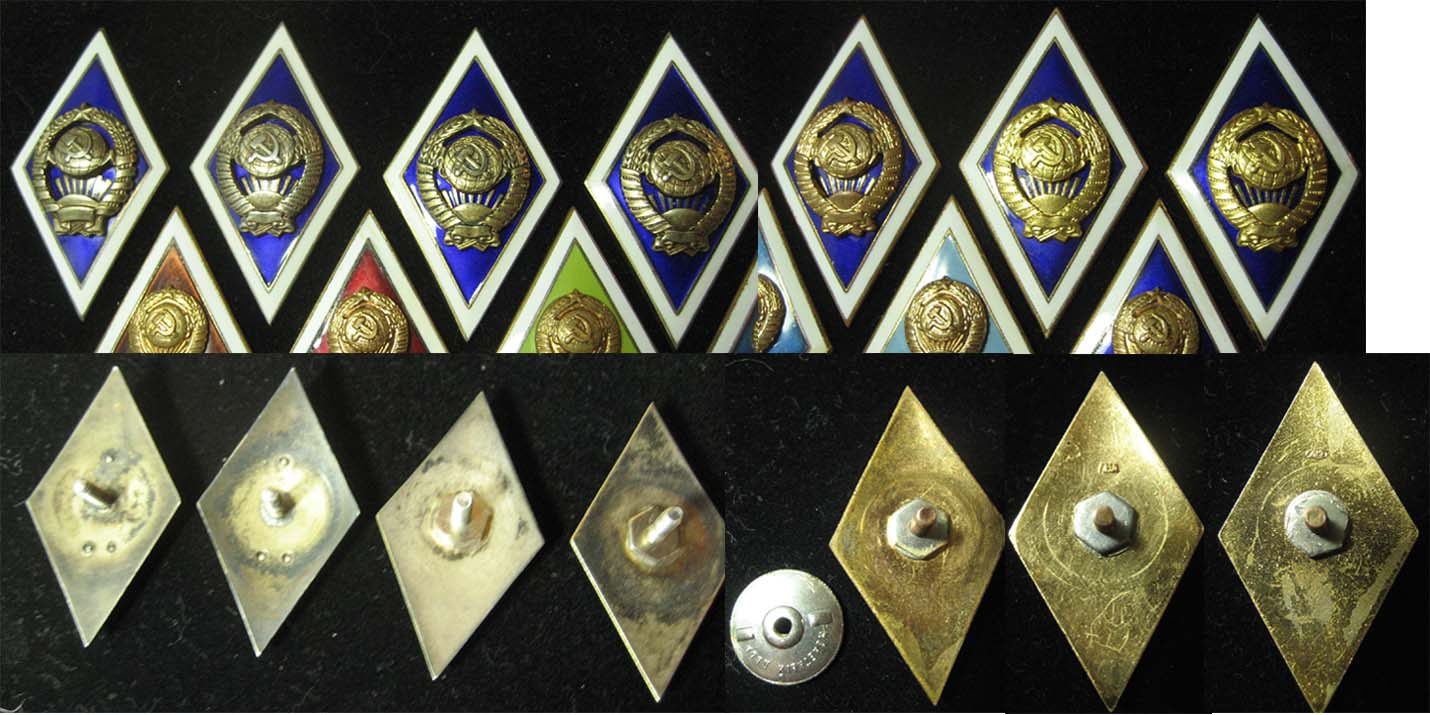 Есть хороший и очень правильный первоисточник - Большая Советская Энциклопедия... но не поздняя, а именно образца 1952 г., синего цвета. Так вот там, в статье "Знаки нагрудные для выпускников высших учебных заведений СССР" для примера описываются 3 знака: Ромб Госуниверситета, знак МВТУ им.Баумана, и знак об окончании горных институтов.