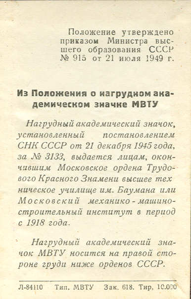 Небольшое подтверждение, правда про МВТУ, и не из БСЭ, а из дока к выпускному значку. Здесь все достаточно четко прописано про то, кто и как его получалY-Ola писал(а) : Друзья!