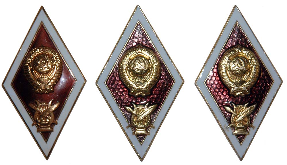 Красный с книжкой-это институт культуры. Tёмносиний для пед. институтов- факультетов искусств и музыки (не путать с консерваториями). Для педагогов других профилей был голубой фон.Красин писал(а) :Подскажите. пожалуйста. что это за Вузы?