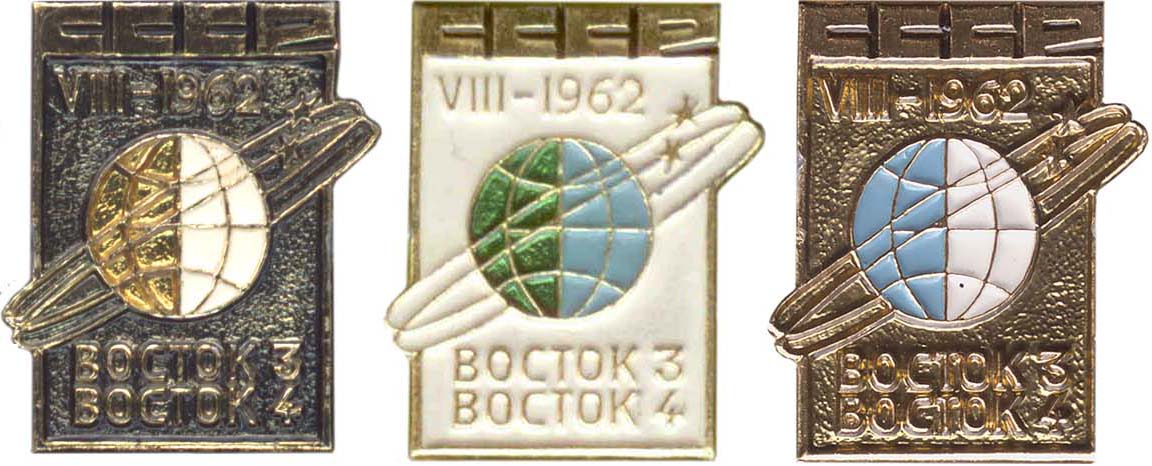 Вот варианты показанного значка в обычном исполнении. До сих пор находились у меня в разделе "неклассифицированные". Большое спасибо, Markp!markp писал(а) :Экспортный вариант значка Восток-3/Восток-4 с надписью MADE IN USSR на обратной стороне. От своего обычного "собрата" отличается более качественной эмалью.