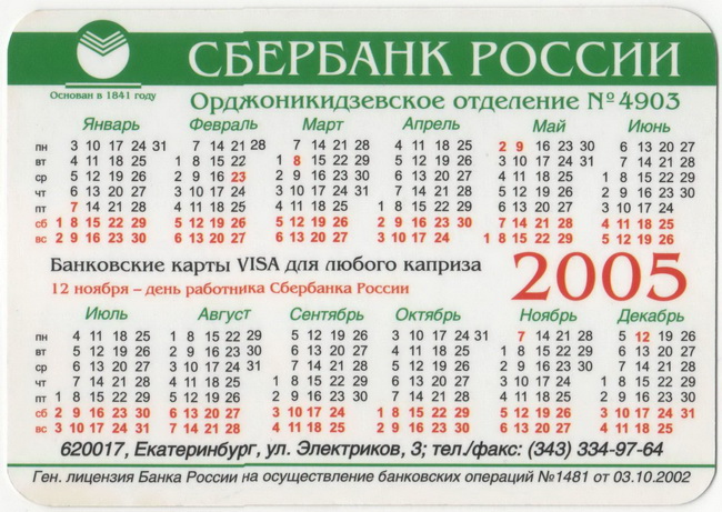 Карманный календарик "г.Екатеринбург. Сбербанк России. Орджоникидзевское отделение № 4903. 2005 г."