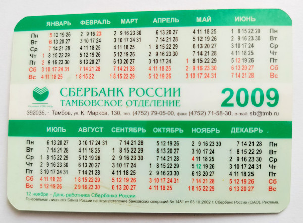 Карманный календарик "Уралфинпромбанк. 2009 г."