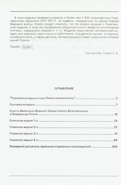 В этом издании приведены сведения о более чем 3800 награжденных Георгиевскими медалями 1914-1917 гг. за подвиги, совершенные во время Первой мировой войны. Данные представлены в виде таблиц по степеням (Ф.И.О., Чин, Часть, Дата награждения, № знака, Описание подвига, Документ, Примечание). Сортировка сделана по номеру награждения в порядке возрастания.