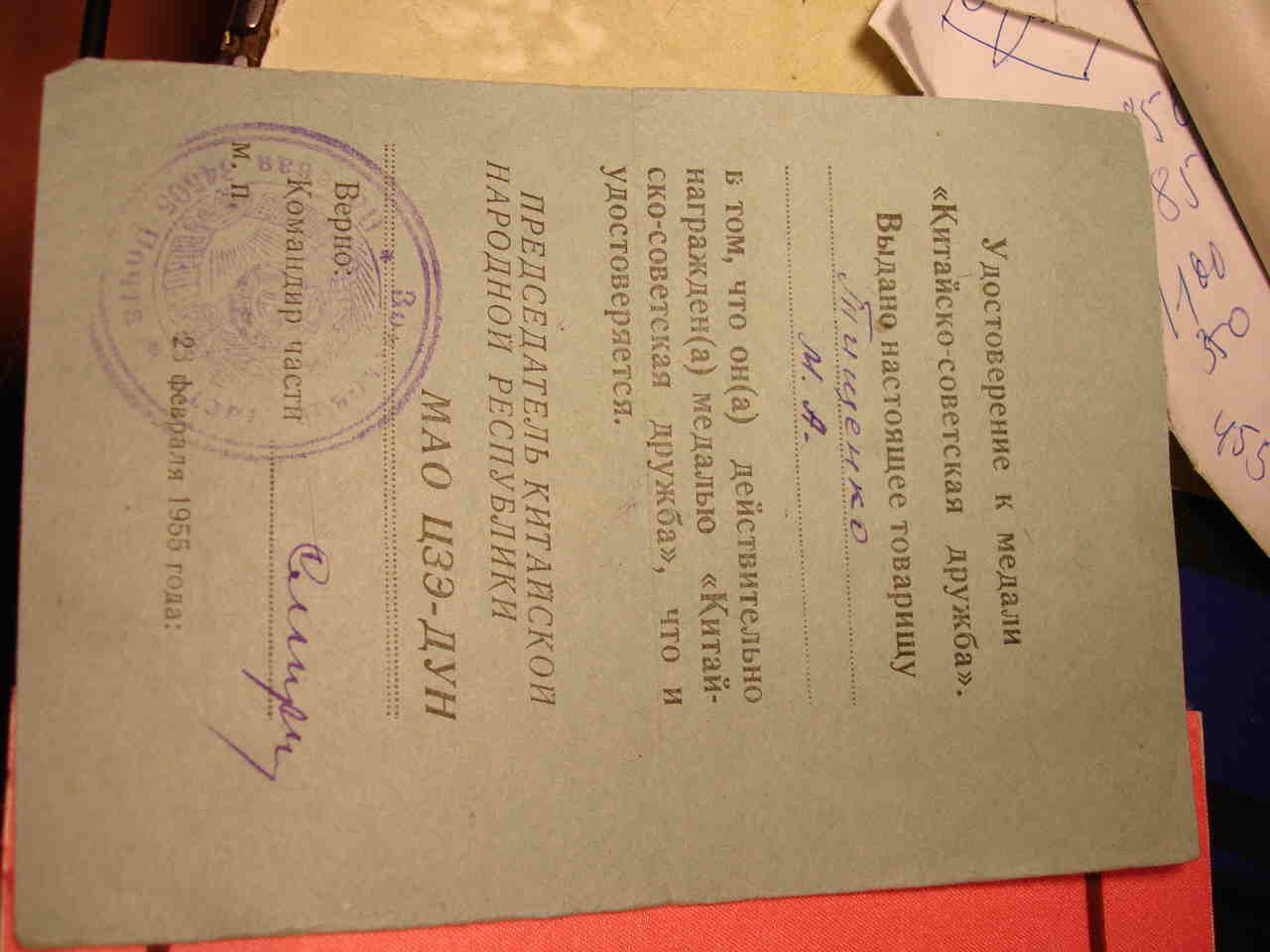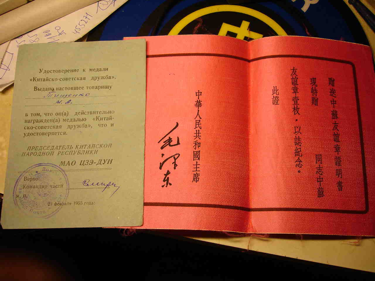 Кстати к китайским медалям выдавали вот такие интересные удостоверенияmik461 писал(а) :Медали китайско-советской дружбы