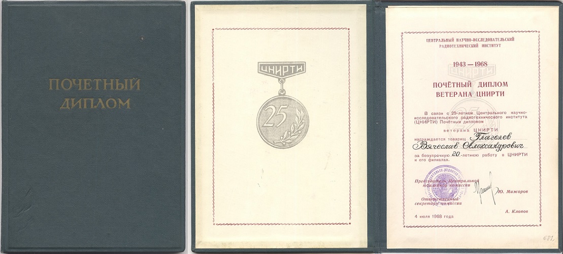 Удостоверение к знаку и почетный диплом в честь 25-летия ЦНИРТИ