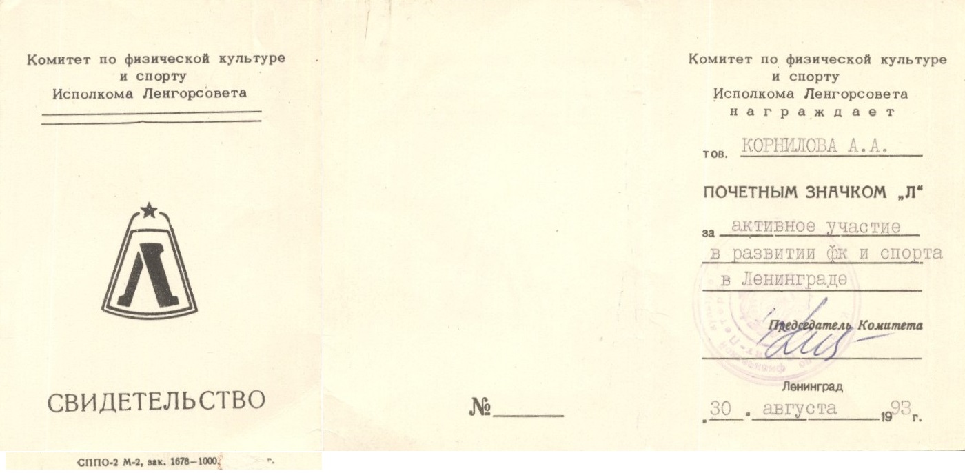 Удостоверение к почетному знаку "Л"