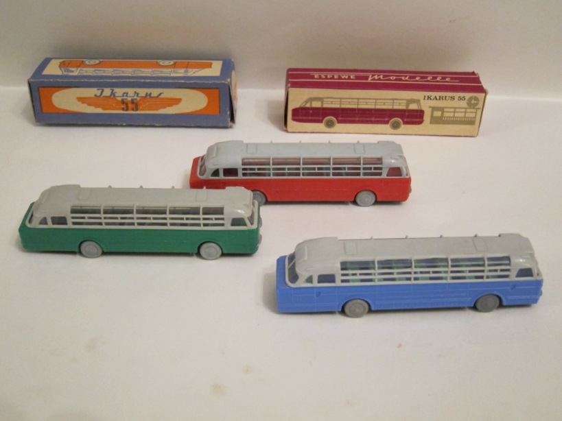 1. Корпуса автобуса Икарус-55 были выпущены в цветовой политре из 9-ти выриантов пластмасс, а верхняя часть - в 6-ти вариантах. Самым редким и дорогим является так называемый вариант "I" с салатовым корпусом и верхом (оценка "LP"). Остальные варианты 55-го имеют примерно одинаковую стоимость в районе 25-35 EUR за модель.