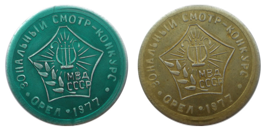(ситалловая вставка в алюминиевой оправе, крепление - игла, на обратной стороне есть надпись - Омск)
