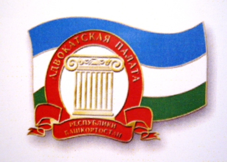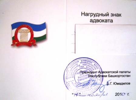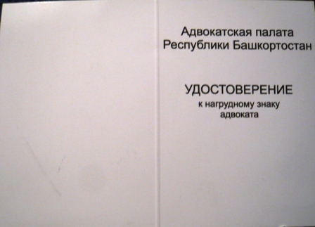Всем адвокатам Республики Башкортостан выдавались фрачные знаки, типа заливных, лакированных, на клипсе. Показываю изображение знака и удостоверения к нему.