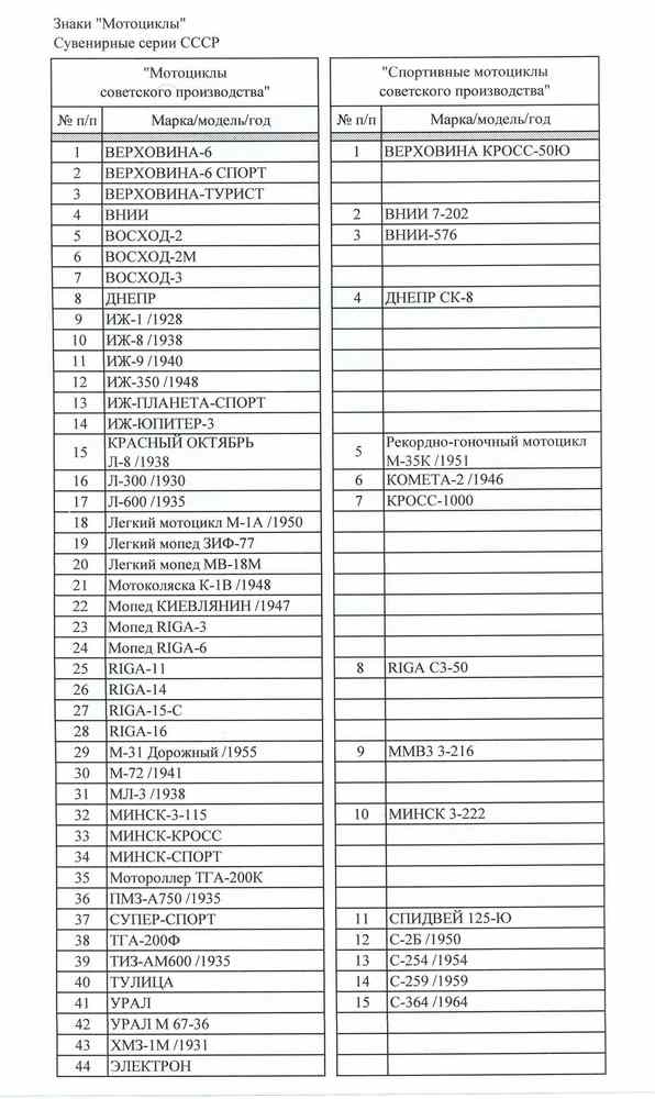 У вас "проскользнуло" 2 дубляжа: "Мопед RIGA 6" - "RIGA-6", "Мопед RIGA 3" - "RIGA-3"Семен Трофимов писал(а) :Извиняюсь, не ожидал, что сайт всё так плотно сдвоит. Жаль, было очень красиво напечатано. Теперь придётся всматриваться. Кое где будет написано в две строчки. Это и есть знаки, которые ищу. Есть 50 знаков, не хватает 12 ( с последней поправкой) и того 62 знака. Наверное это истина.