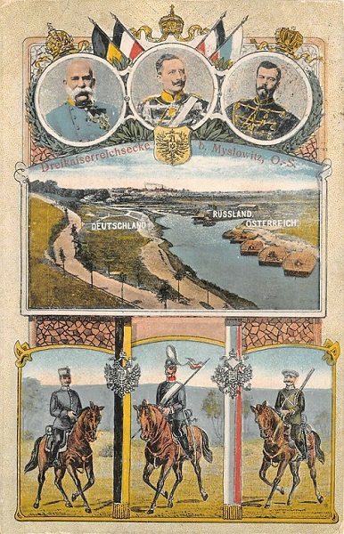территории немецких монархий - звучит некорректно. Австро-Венгрия никоим образом не немецкая монархия.Там действительно был перекрёсток трёх империй. Российская империя буквально вклинивалась в территории немецких монархий.