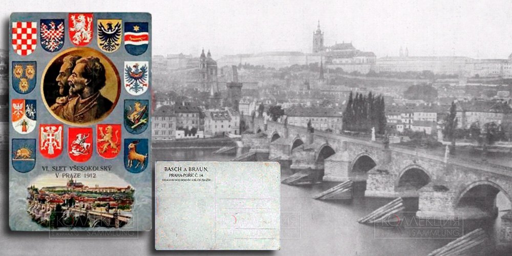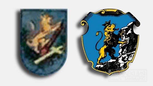 Благодарю!С вероятностью 99% это герб Галиции (бывш. Русского воеводства Польши). Исторический герб Галиции – золотой лев, взбирающийся на скалу на синем фоне. Откуда взялся крест, не ясно. Но, скорее всего, это ошибка перерисовки. Скала обычно изображалась с контрастными тенями, одну из которых художник мог принять за крест. На Галицию также указывает то, что на открытке отсутствует австрийский герб Галиции и Лодомерии. То есть лев на скале использован вместо него. Отсутствие двуглавого орла может объясняться плохим отношением к Австрийскому двуглавому орлу. Чехи в начале века считали Австрию главным «душителем» славянства. А российский орёл мог пострадать «за компанию».