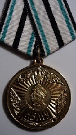 Медаль с помощью ушка и кольца соединена с четырехугольной колодкой шириной 33 мм и длиной 52 мм. Сверху колодка обтянута муаровой лентой синего цвета посредине которой размещены три вертикальные полосы белого цвета.