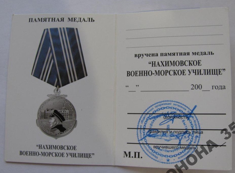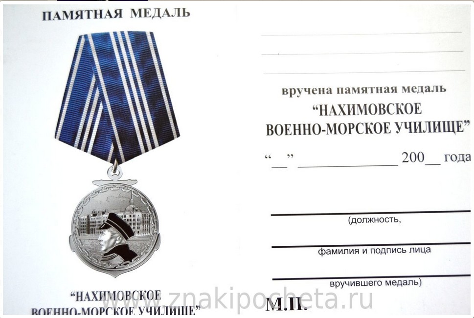 При награждении вместе с юбилейной медалью имени П.С.Нахимова вручается удостоверение установленного образца.