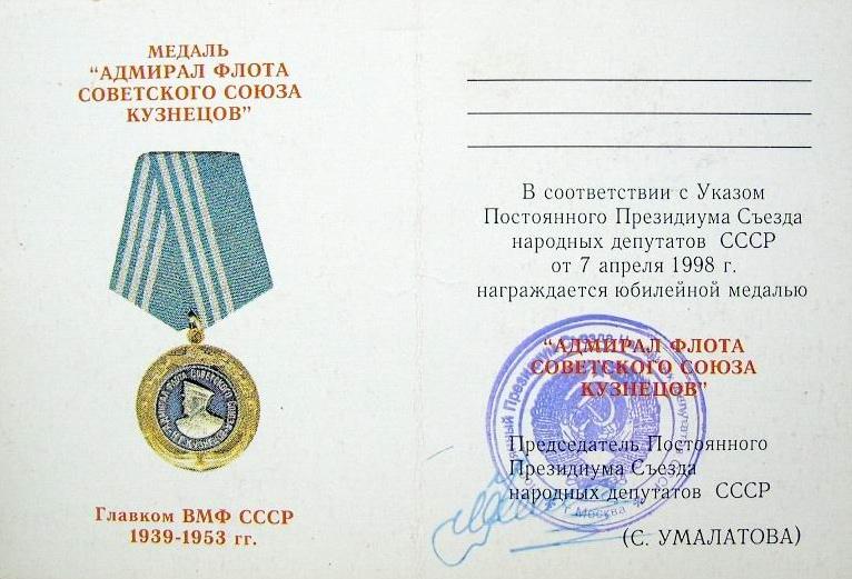 Историческая справка: Орден "Адмирал флота Н.Г.Кузнецов" - флотская награда, которой награждаются граждане за самоотверженный поступок, мужество, отвагу и героизм, совершенные при исполнении воинского, служебного и гражданского долга, проявленные в период службы на Военно-Морском Флоте, а также работе в системе морского (речного) флота.