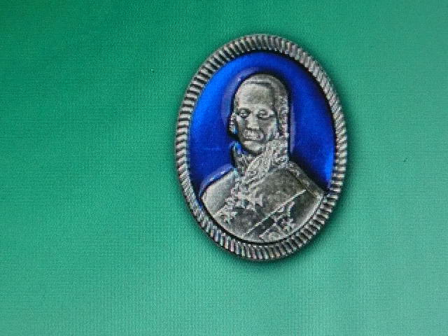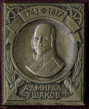 Материал - железо, крепёж - винтовой. Размеры: 5 x 4 см, цвет - жёлтый, лаковое покрытие. В центре, на тёмно-синем фоне портрет адмирала Ушакова. Изготовлен в мастерской военно-морского музея.