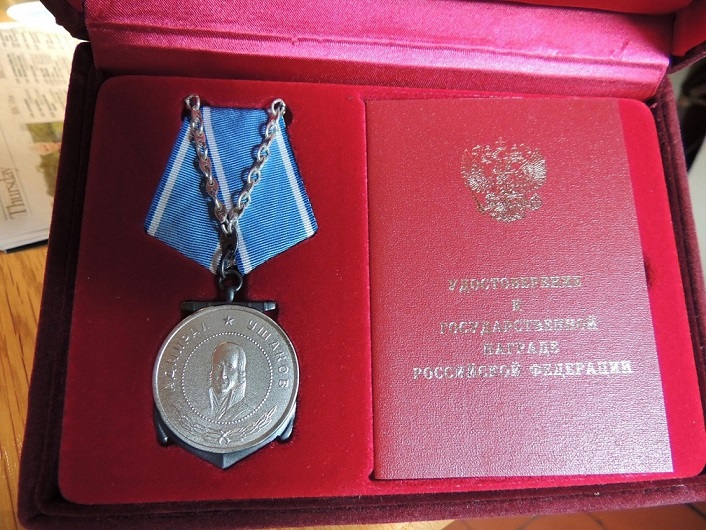 2- Государственная награда Российской Федерации, вручённая Тиму Элкингтону 7 августа 2014 года - медаль Ушакова