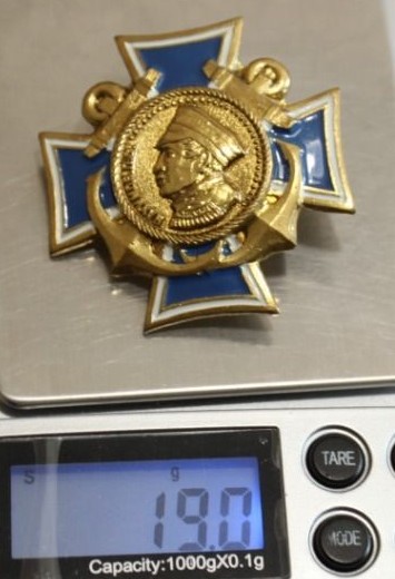Материал - железо, крепёж - винтовой. Размеры: 4,4 x 4,5 см, цвет: морской крест - синий, два якоря - жёлтый. В центре портрет адмирала Нахимова. Изготовлен в мастерской военно-морского музея.