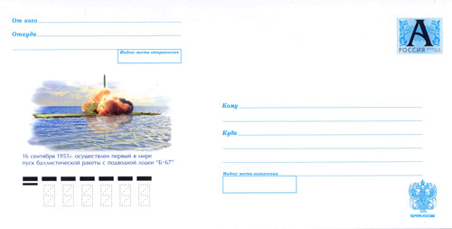 - ПОЧТОВЫЙ конверт-2005.04.01-03 16 сентября 1955 г. осуществлен первый в мире пуск баллистической ракеты с подводной лодки "Б-67".