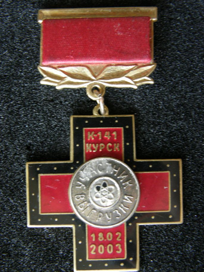 Your Kursk badge with large "V" ("5" roman number) was not made on the occasion of anniversary of launching, but on the occasion of fifth anniversary of wreck. That's why the Navy flag is half-mast designed.