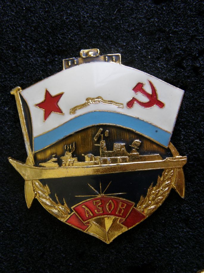 В дополнение к БПК "Петропавловск", месяц назад показанному уваж. iek, парочка братьев "по классу" - У меня в коллекции таких три знака, причём "Азов" отличен от остальных (ленточка на белом поле флага ВМФ и абсолютное иное якорное кольцо, да и под килем уменьшенная в размерах, звёздочка)... Подскажите, пожалуйста,- это условная серия из трёх знаков или известно их более 3-х?