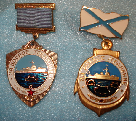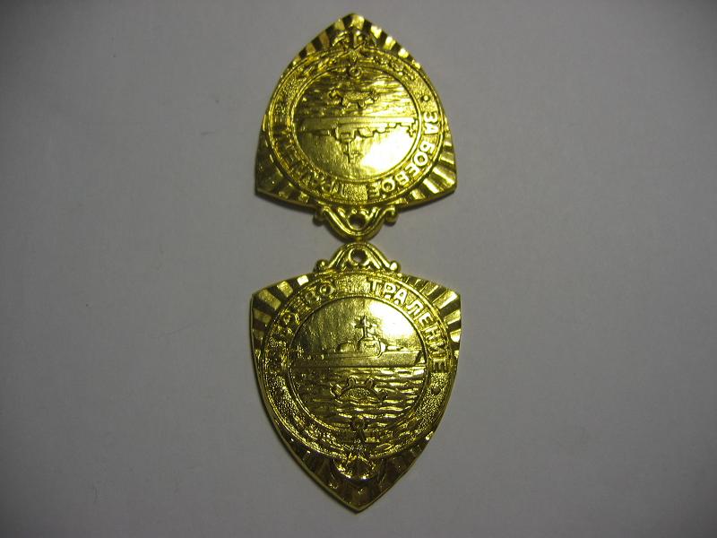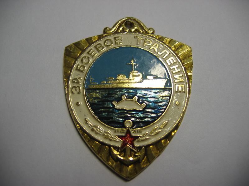 а у меня на знаке она белая..."ЗА БОЕВОЕ ТРАЛЕНИЕ". В нижней части - красная пятиконечная звезда с точечной насечкой под эмалью, наложена на адмиралтейский якорь, а также дубовая, справа, и лавровая, слева, ветви.В центральном медальоне, на голубом фоне неба изображен идущий влево тральщик. Ниже, на фоне темно-синего моря (с волнообразной насечкой под эмалью) видна всплывшая черная якорная гальваноударная мина...