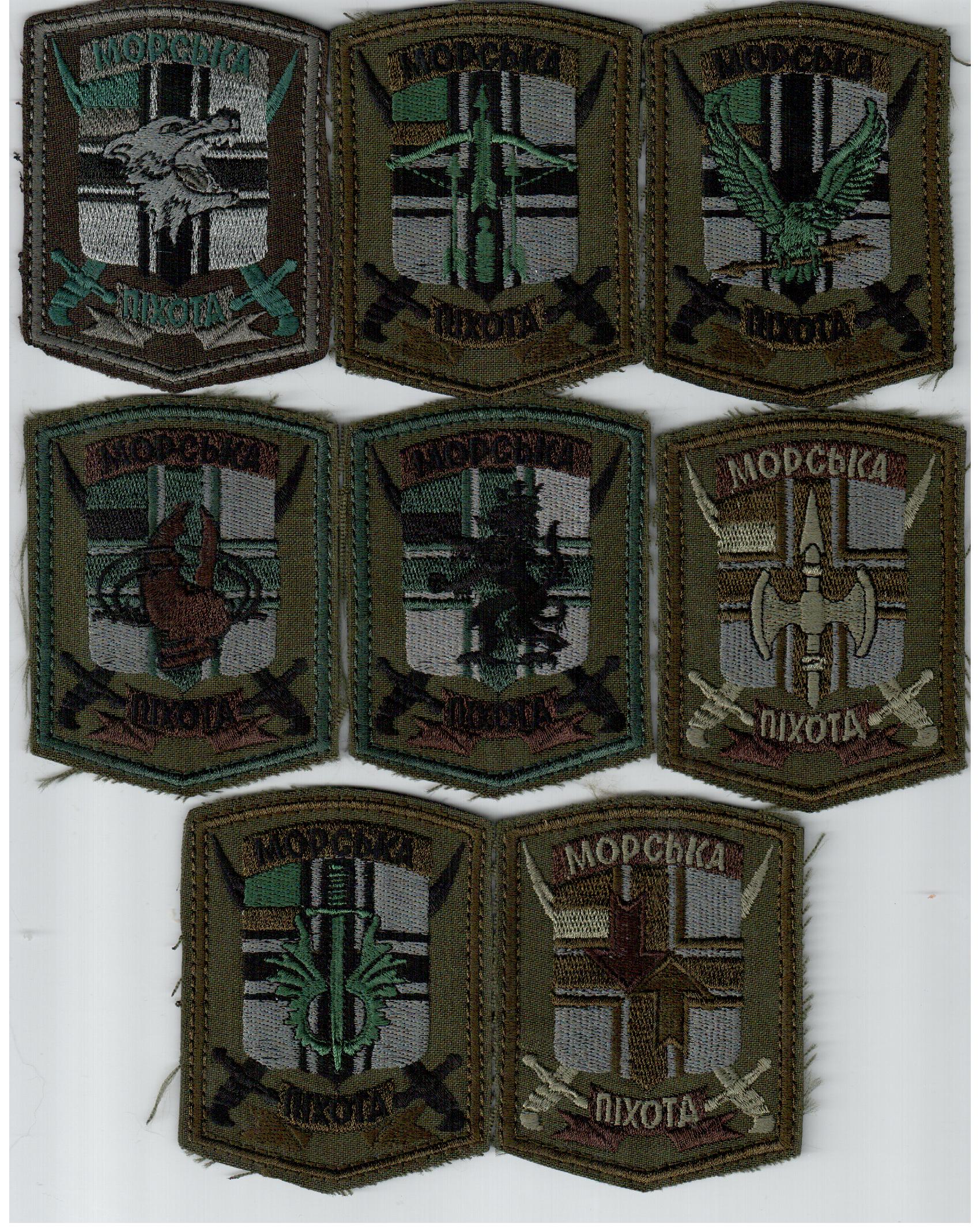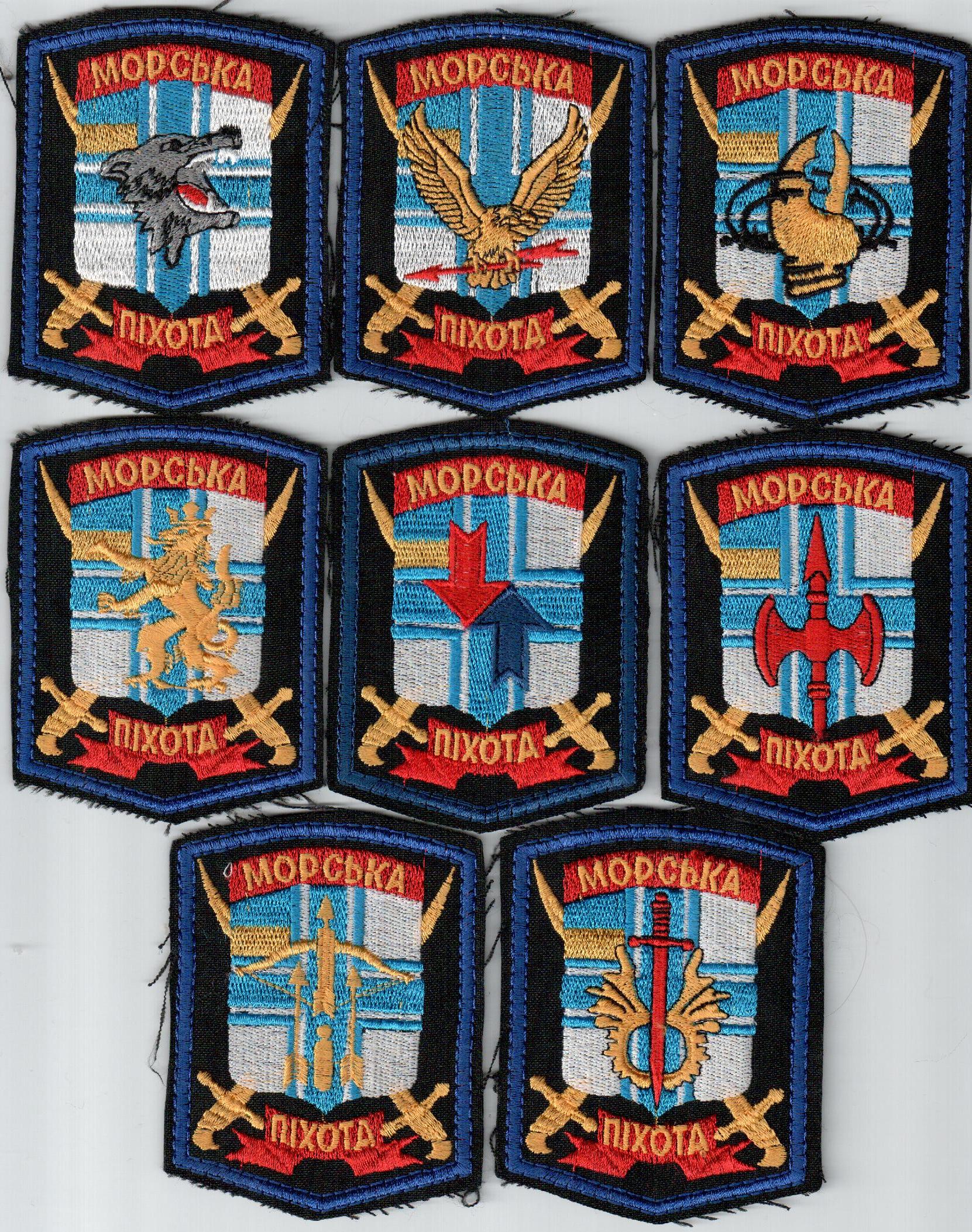 Следует заметить, что идея такого нарукавного знака позаимствована у морской пехоты Великобритании (квалификационная нашивка "Commando"). Только там не трезубец (понятное дело), а просто кинжал. А вот такие украинские есть у меня. Слева внизу - старенькая нашивка с волком (90-е), правее - современная продукция.Олег К писал(а) :"Трезубец МП" знак носится на левом рукаве от верхнего шва ПШ, такойже вариант и в полевом исполнении на полевой форме.