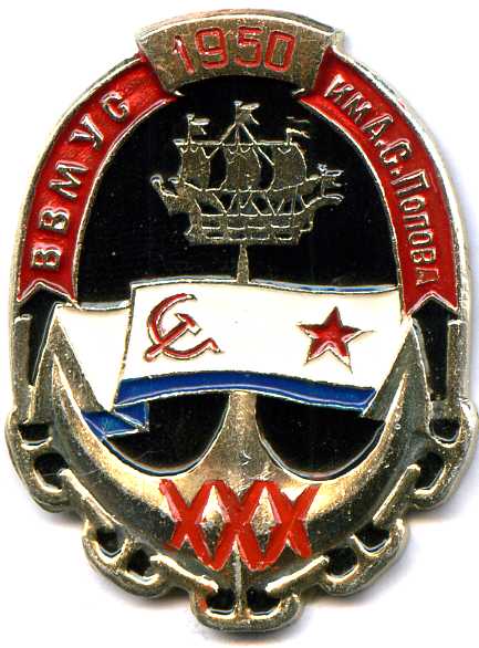 Действительно, судя по годам, это юбилейный знак первого выпуска корабельного (радиолокационного) факультета ВВМИРТУ. В общей истории ВВМУРЭ им. А.С. Попова (ВМУС-ВВМИРТУ-ВВМУРЭ) это 5-й выпуск радиолокационного фактультета. Первый был в 1950 г. (В 1954 г. был пропуск в связи с переходом на 5-летнее обучение). Выпускной ротой командовал И.П. Филимонов. (Для любителей маринистики небезинтересно будет узнать, что он послужил прототипом командира роты в повести Б. Штейна "Отплытие").