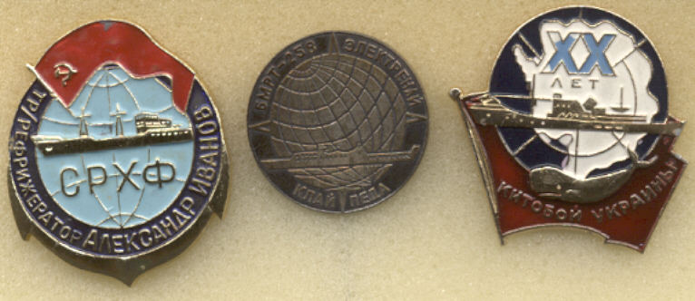 Добавлю, что если на республиканском уровне объединения рыболовецких колхозов сущесвовали традиционно, то насоюзном уровне до 1985 г., т.е. начала перестроечных лет такого объединяющего органа не было. В 1985 г. состоялся Учредительный съезд Союза рыб. колхозов СССР (позже России) и есть соответствующий значок. Сейчас под рукой его нет, покажу позже. Вот два других.