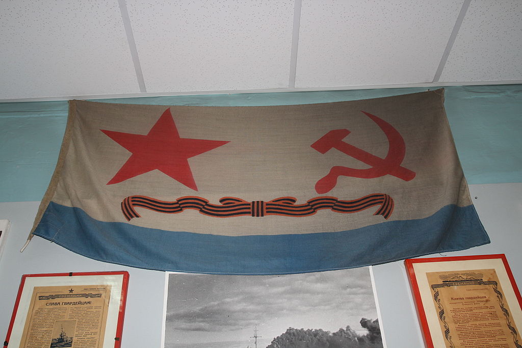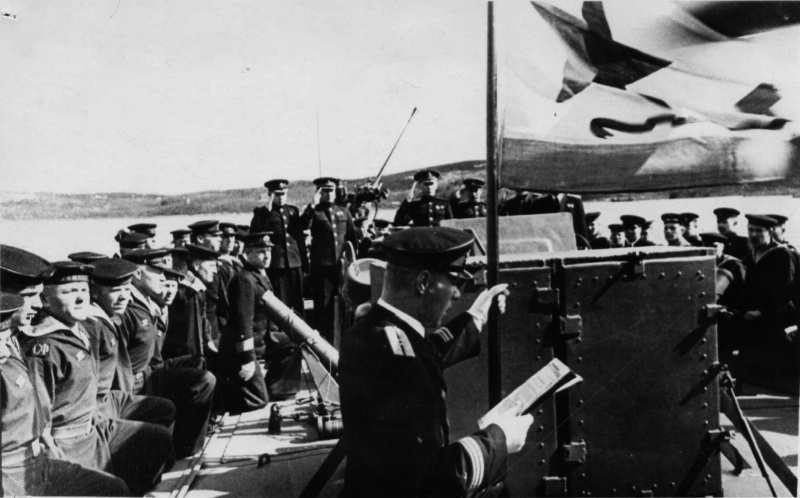 Звучит гимн Советского Союза. Медленно поднимается гвардейский флаг. К нему устремлены взоры экипажа. Гремит громкое матросское «УРА».