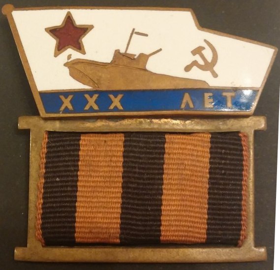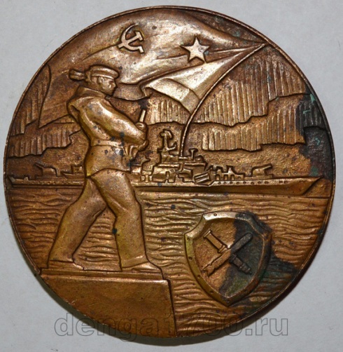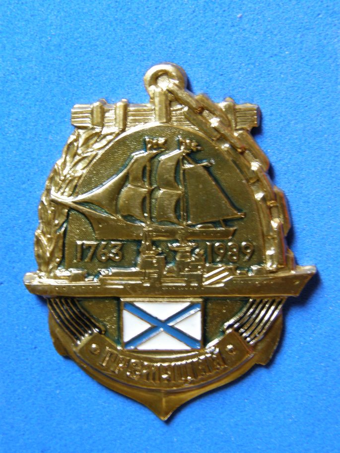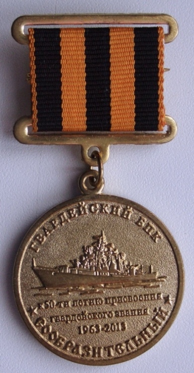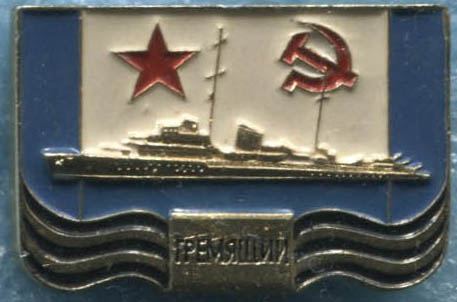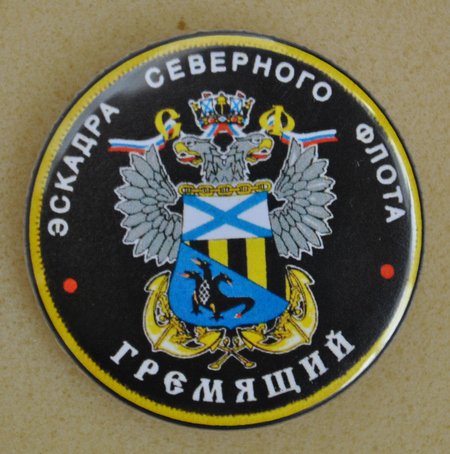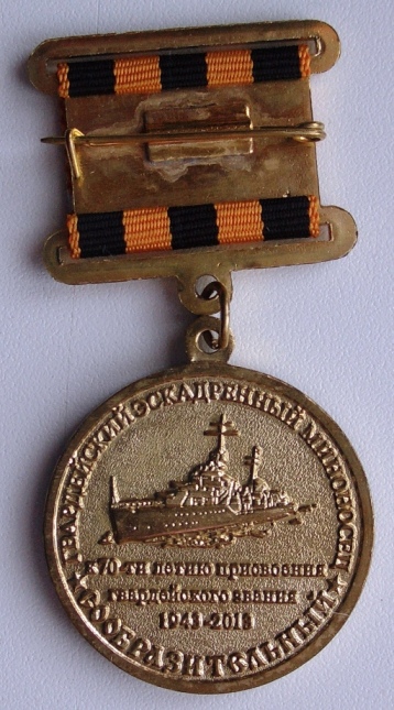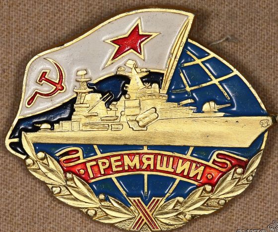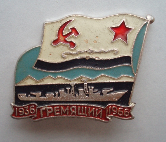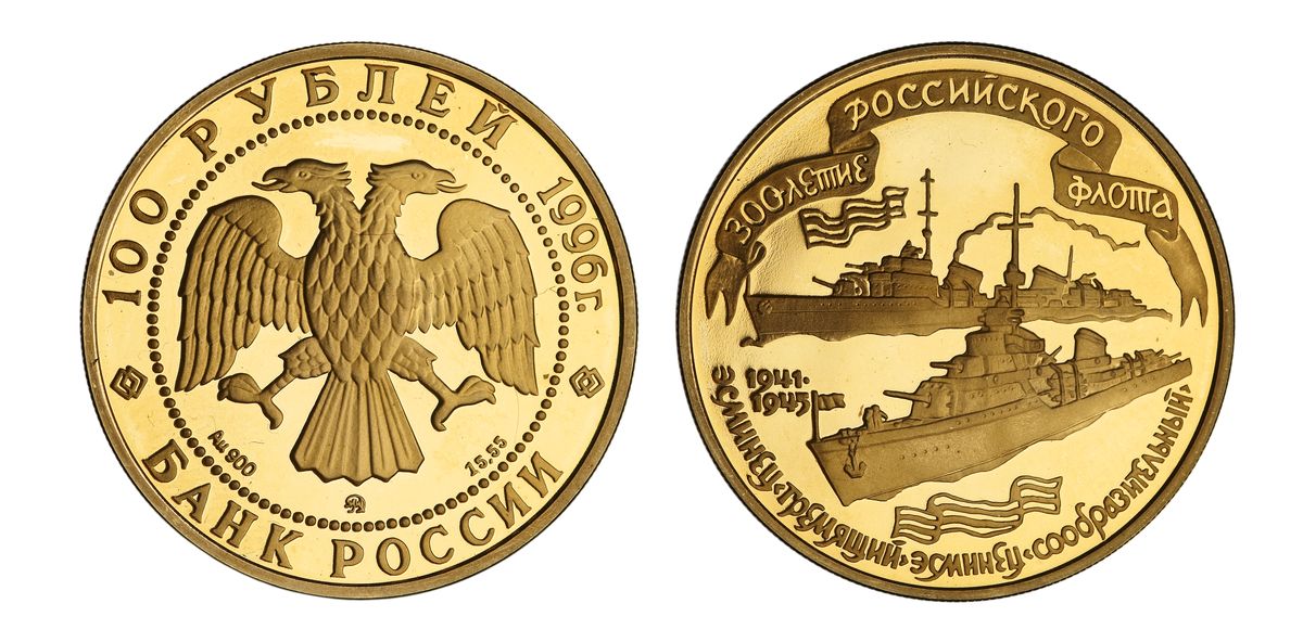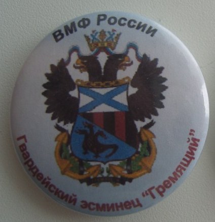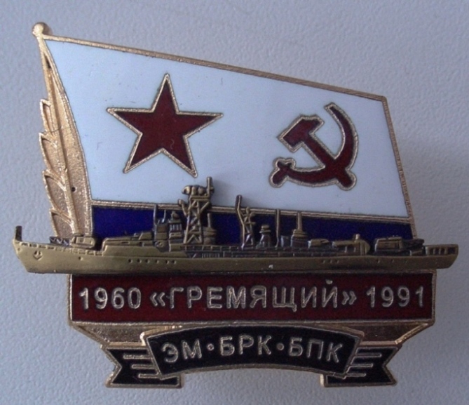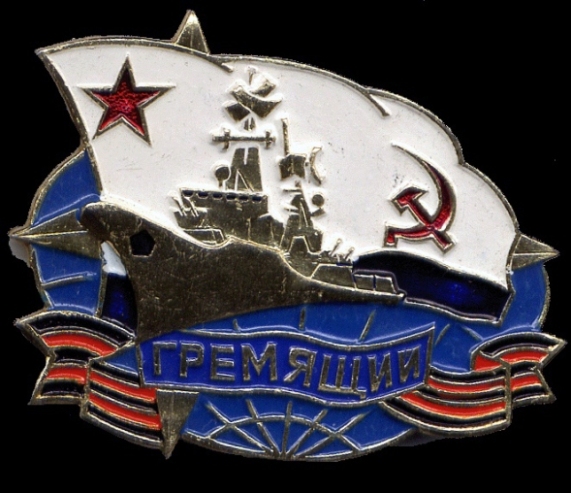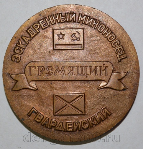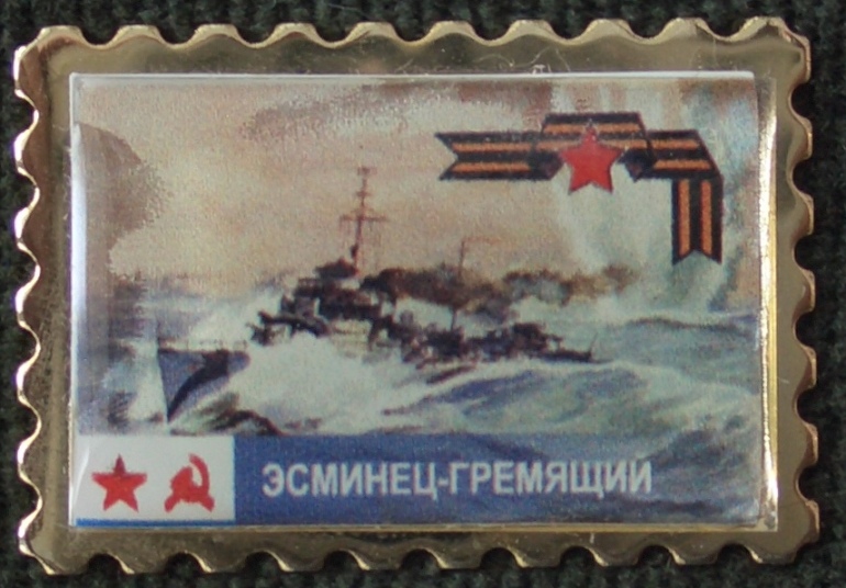 изображения эсминцев "Гремящий" и "Сообразительный", слева - дата в две строки: "1941 · 1945", по окружности - надписи: вверху на ленте - "300-ЛЕТИЕ РОССИЙСКОГО ФЛОТА", внизу - "ЭСМИНЕЦ <ГРЕМЯЩИЙ> <ЭСМИНЕЦ СООБРАЗИТЕЛЬНЫЙ>".