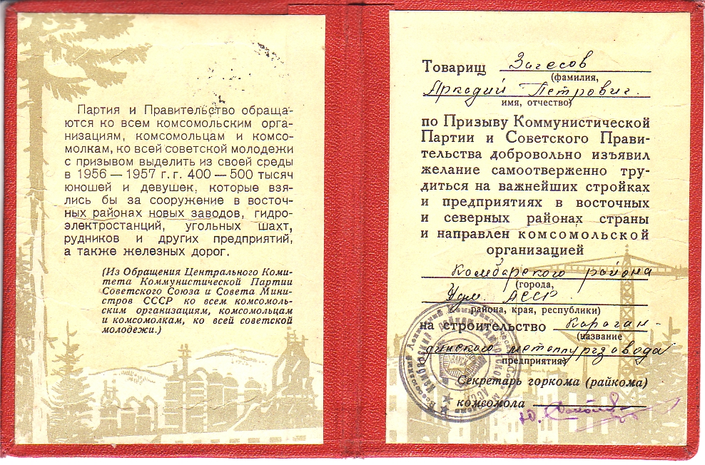 Нашлась и комсомольская путёвка одного из участников ПРИЗЫВА.Aleksandr писал(а) :Кармет - это скорее всего Карагандинский металлургический комбинат, кльлоый был одним из крупнейших металлургических предприятий СССР. Находился он в г. Темиртау Карагандинской области Казахской ССР. Образован в 1970 г. на базе Карагандинского металлургического завода. В его состав вошли также Казахский металлургический завод, Атасуйское и Южно-Топарское рудоуправления и Алексеевский доломитовый карьер. Топливной базой служили коксующиеся угли Карагандинского угольного бассейна. Продукция комбината - чугун, сталь, листовой и сортовой прокат, кокс и продукты коксохимии.Анатолич писал(а) :Прошу поделится информацией о "призыве", которому 30 лет.
