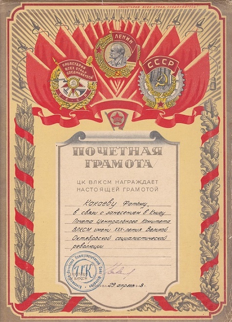 Занятный документ 1948 г. Тут тебе и грамота и занесение в книгу почета ЦК ВЛКСМ. Подпись секретаря Иванова Всеволода Николаевича. После него секретарей ЦК ВЛКСМ уже не расстреливали...