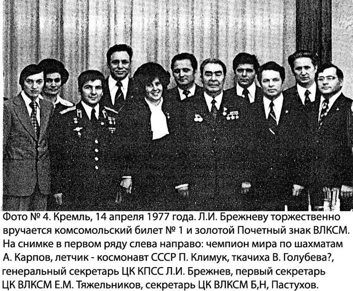 Chinovnik писал(а) :Из публикации в журнале "Советский воин" . Статья "Знаки отличия ЦК ВЛКСМ" - "высшей наградой Ленинского комсомола является Почетный знак ВЛКСМ, учрежденный 28 апреля 1966 года. Вместе с комсомольским билетом № 1 он был вручен товарищу Л.И. Брежневу за выдающиеся заслуги перед комсомолом и международным молодежным движением". 15 съезд ВЛКСМ наметил обмен ком. билетов в 1967 году. Обмен билетов был также и в течение 1975 и 1976 года. Решение 17 съезда ВЛКСМ. Конечно был смысл вручать Брежневу новый билет. А вот был ли знак золотой? С ув.