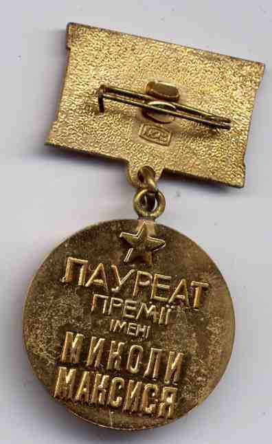 То, что премия им. Максися комсомольская очень сомнительно, на знаке нет ни комсомольского значка ни слова комсомол в названии премии. Нужны первоисточники.Vjacheslav писал(а) :Памятник поэту Н.П.Максисю, погибшему в 1848 году, находится в Ровенской области. Значит, это Ровенская областная премия. Комсомольская ли - не знаю, скорее, комсомольская, совмещенная с кем-то еще.laz писал(а) : А про Максися никто не знает.