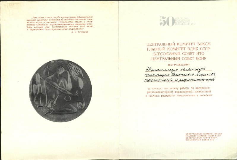 Anatoliy писал(а) Вс, 02 июн 2013 11:59:37: ↑ Медаль ЦК ВЛКСМ "Выставка молодых новаторов социалистических стран". Диаметр - 14 см.