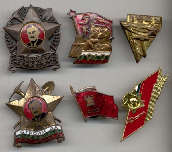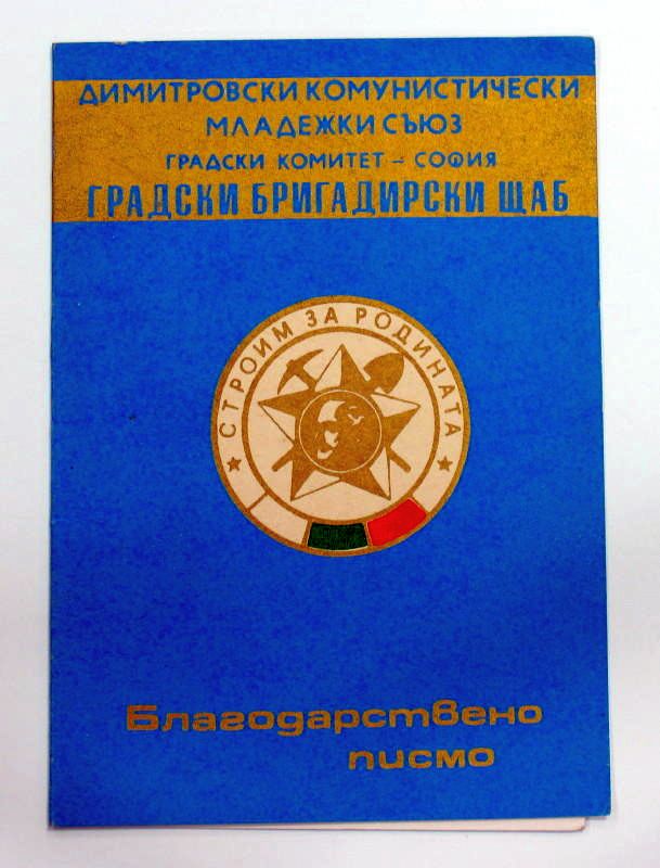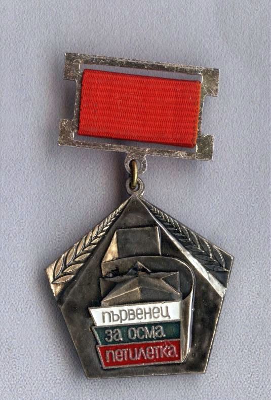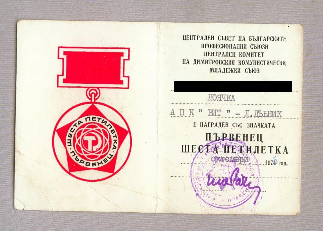 Знак "Ударник шестой пятилетки" и удостоверение к нему, выданое Центральным Советом профессиональных союзов Болгарии совместно с Центральным Комитетом Димитровского коммунистического молодежного союза (ДКМС).