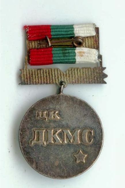 Медаль Центрального Комитета Димитровского коммунистического молодежного союза (ДКМС) - "За заслуги перед молодежью и ДКМС". Размер колодки 20 х 20 мм. Диаметр подвески 25 мм.