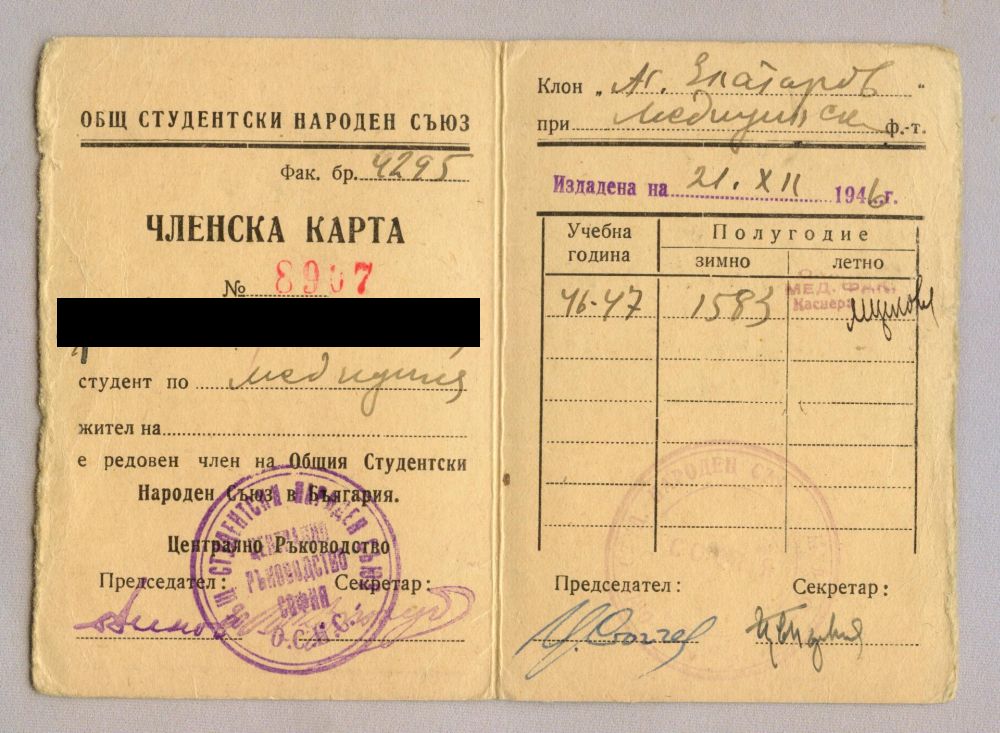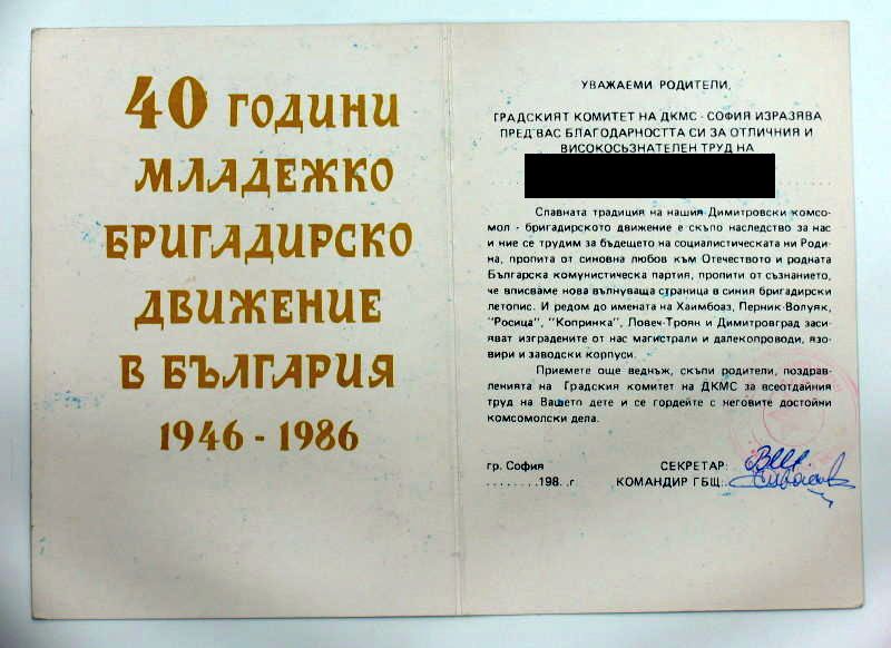 А для более старших комсомольцев-студентов ВУЗов у ЦК ДКМС совместно с МНП имелся свой знак - "За отличную учебу". Реверс гладкий. Удостоверение заверялось подписями Министра народного просвещения Болгарии и Секретаря Центрального Комитета Димитровского коммунистического молодежного союза.