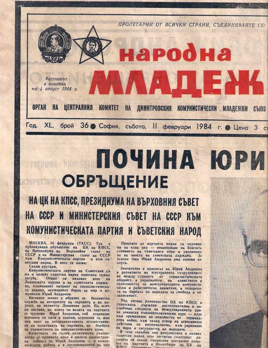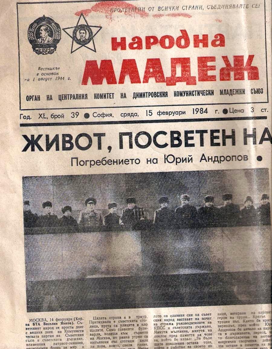 Два экземпляра центрального печатного органа ЦК ДКМС, газеты "Народная молодежь" от 11 и 14 февряля 1984 года.