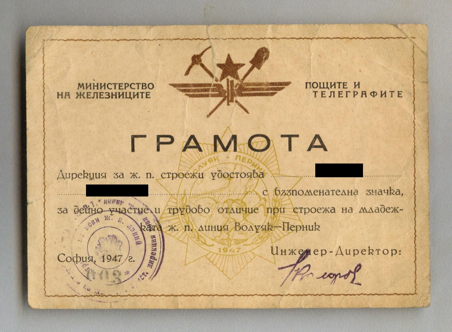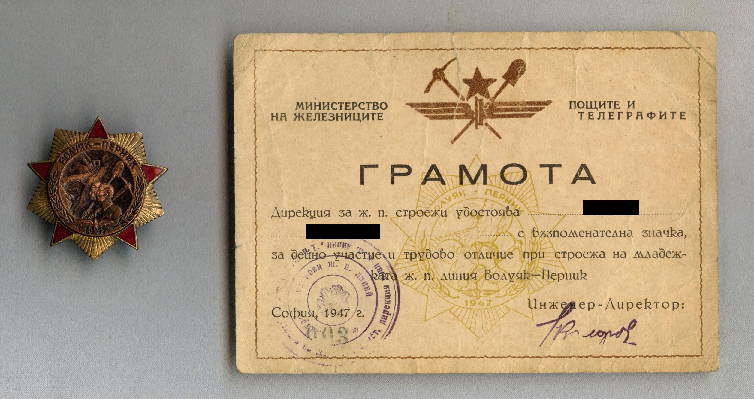 Документ к показанному выше знаку.nasa_astronaut писал(а) :Памятный знак "За активное участие и трудовое отличие при строительстве молодежной железнодорожной линии Волуяк - Перник", 1947 г.