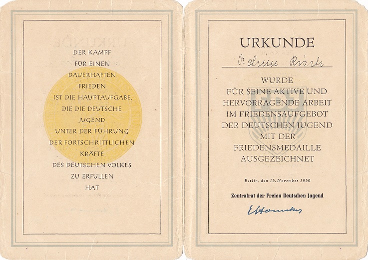 Медаль Центрального Комитета Союза Свободной Германской Молодежи. Называется "Мирный призыв германской молодежи".