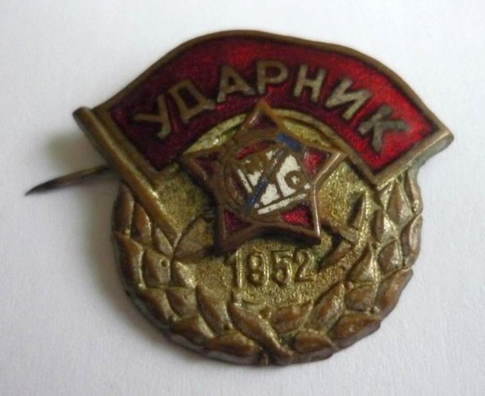 Знаки "Ударник" периода 1952, 1958, 1960, 1961, 1962, 1963, 1964, 1967 годов (различаются языками нанесенных на них надписей, конструктивом, сменой названия молодежных союзов).