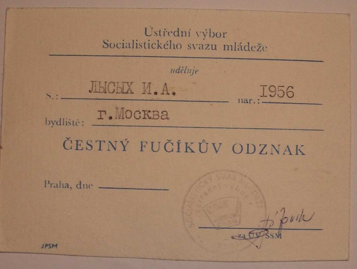 Данным знаком награждались и организации.АДВ писал(а) :В форуме уже обсуждали данные значки. Были предположения что на нём изображён Юлиус Фучик - чешский герой сопротивления. Надпись на всех значках ? LIDÉ BDÉTE! ИМХО: Может это будьте бдительны? Все его относят к комсомолу, но чем он является на самом деле так и не прозвучало. Надеюсь на спецов по чешскому комсомолу.