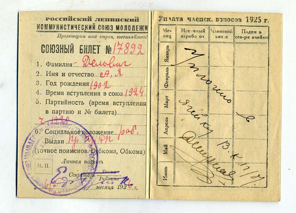 Димончик писал(а) :Приобрел комсомольский билет. Сам билет в общем-то рядовой, но вот выдан он пролетарию с древней дворянской фамилией Дельвиг