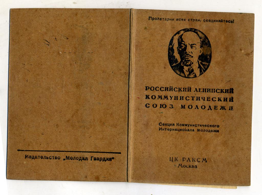 Вариант задней обложки, с указанием ЦК РЛКСМ, и без черты...AlexHH писал(а) :печатались в типографии "Молодая Гвардия" - так точнее наверное будет3. В июле 1924 года на VI съезде РЛКСМ комсомол принял имя Ленина. Отныне профиль Ильича присутствует на обложках комсомольских билетов. В октябре 1924 года ЦК РЛКСМ рассмотрел и решил вопрос о проведении в 1925 году обмена членских билетов. Бланки новой формы теперь изготавливались только в ЦК РЛКСМ и высылались в крайкомы, обкомы и губкомы, где устанавливалась по-прежнему своя нумерация билетов