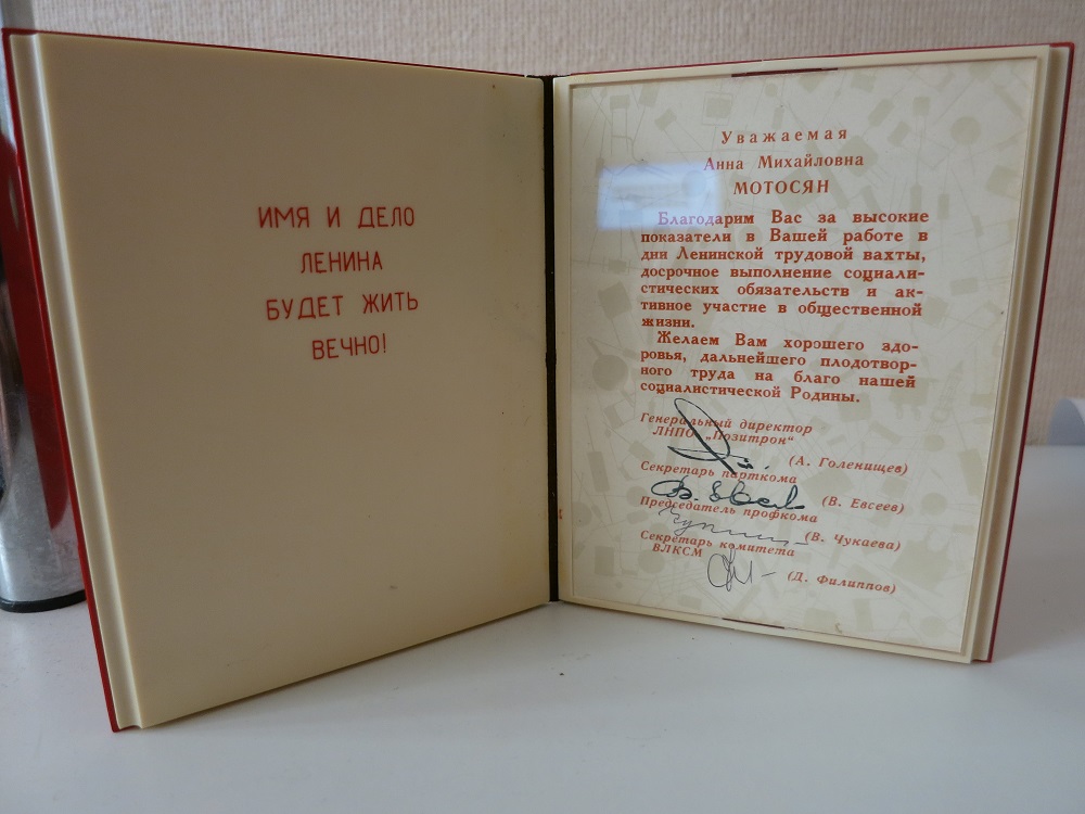Благодарность ЛНПО "Позитрон" 1970 г.