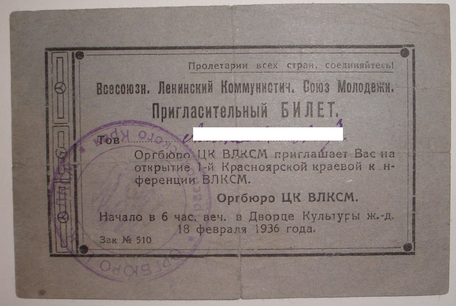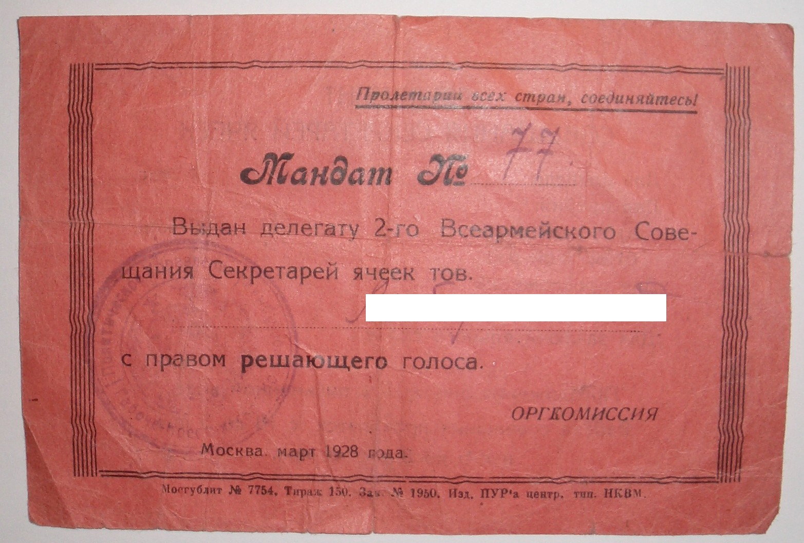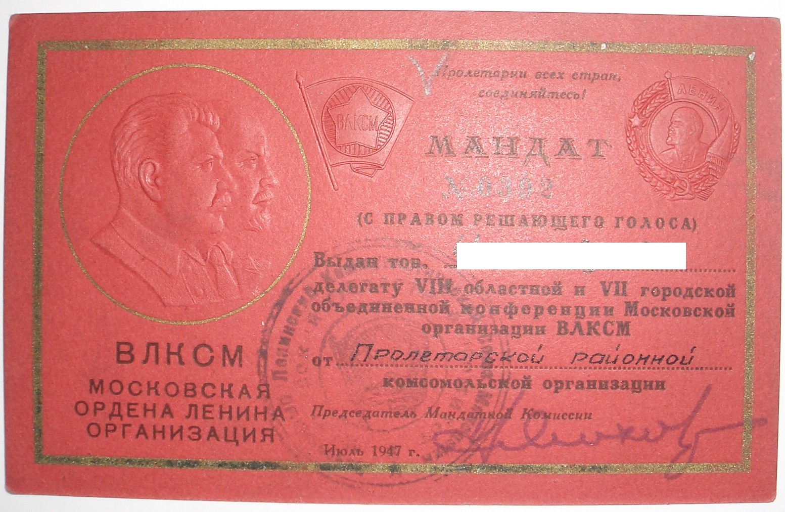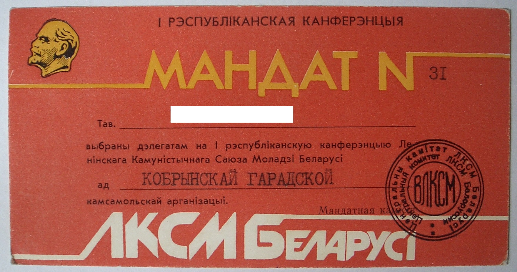 Мандат делегата 1-го съезда ЛКСМ Молдавии выдан после присоединение Бессарабии и образования Молдавской ССР.